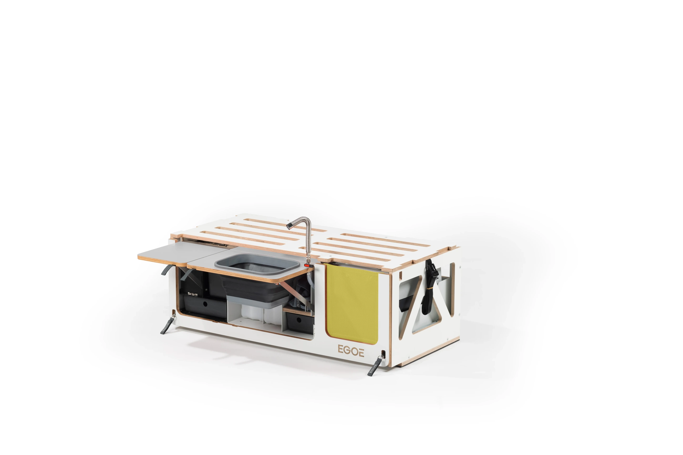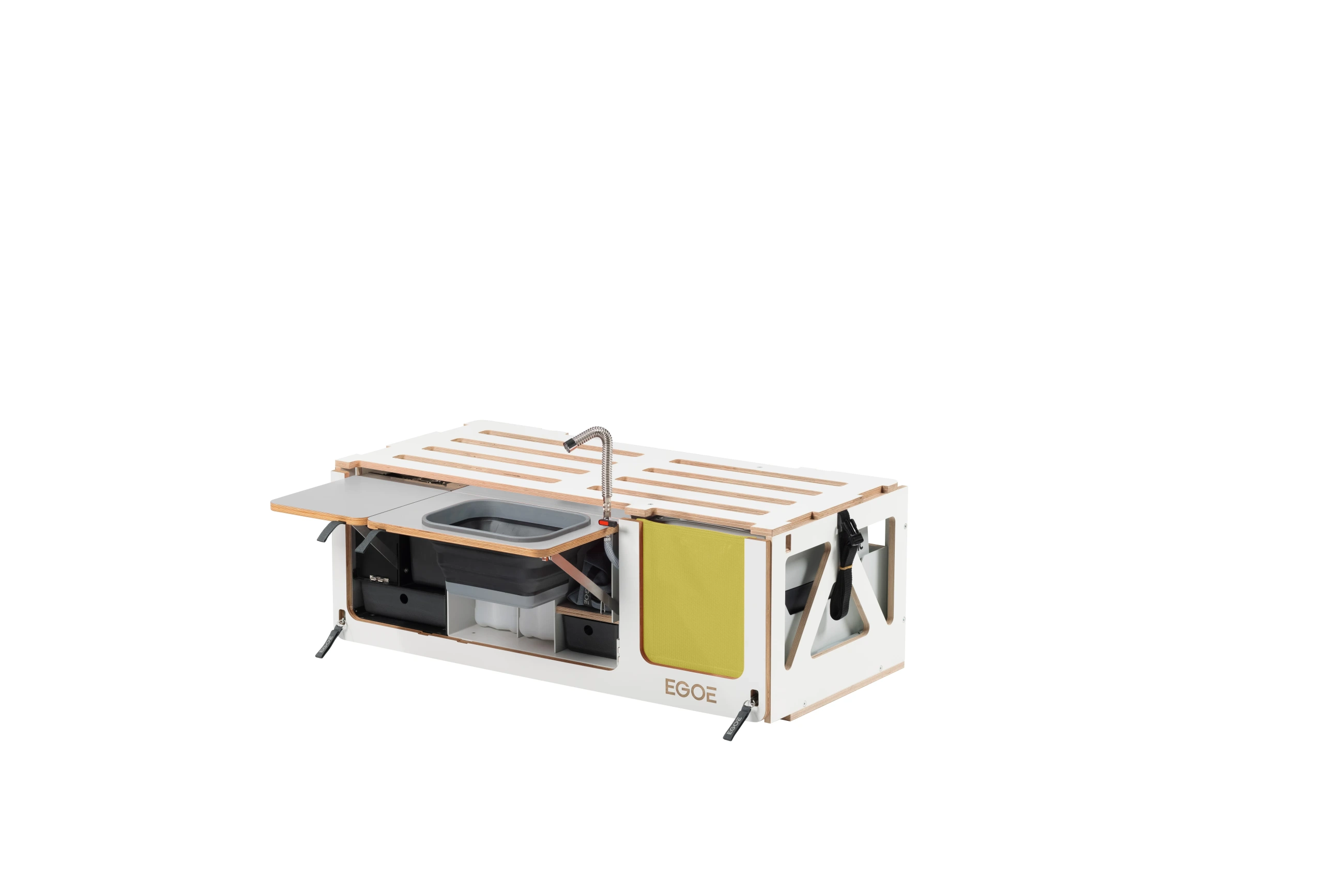 Kuchyňský set Hiker 100 je určen pro ty, kteří již mají vyřešené spaní a potřebují plně funkční a mobilní kuchyni i do menšího vozu. Promění zadní část vašeho vozu v prostor pro přípravu jídla s tekoucí vodou a vařičem.