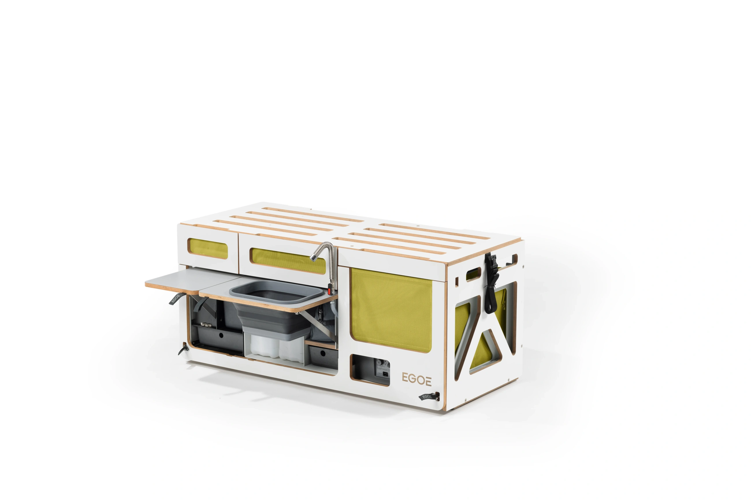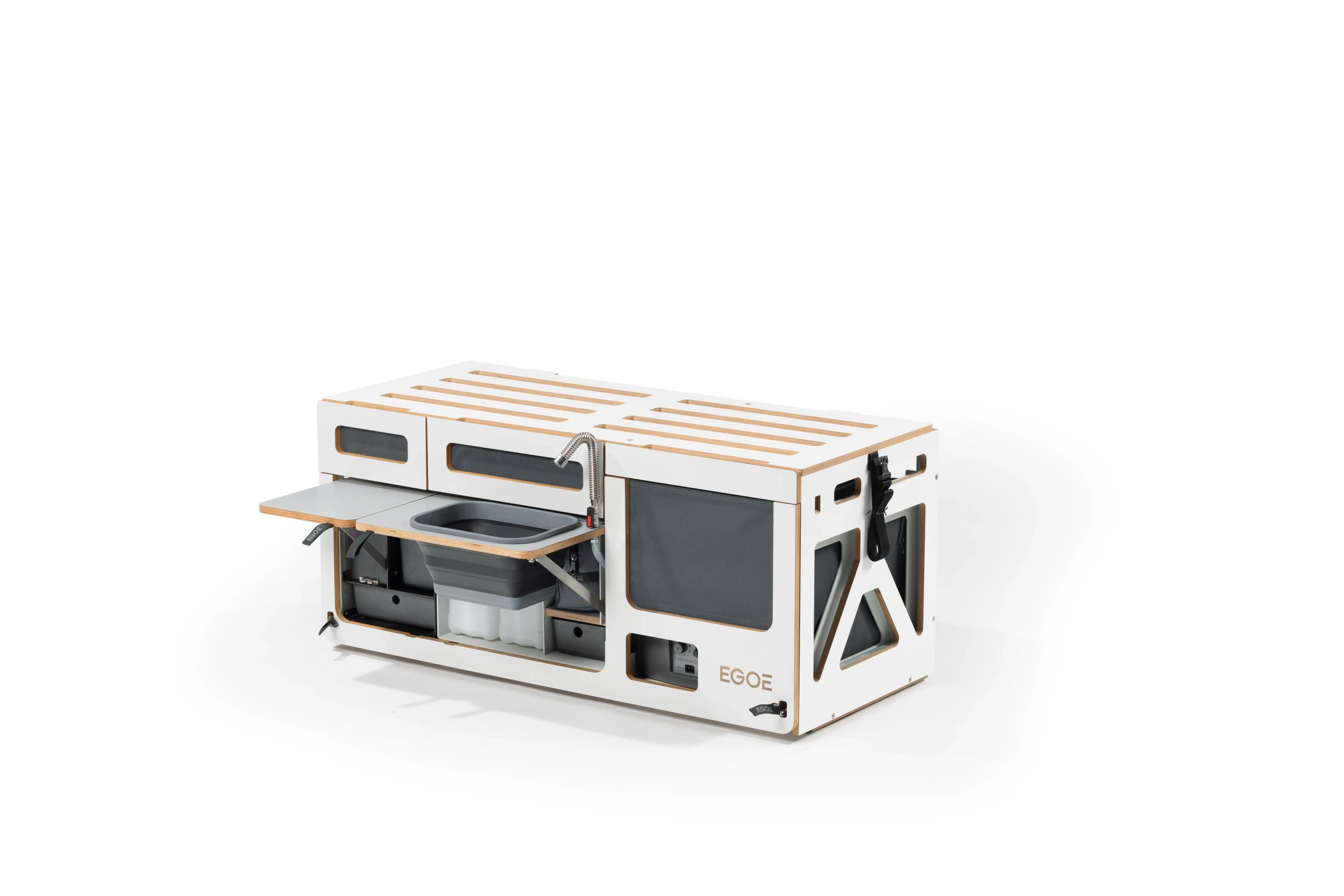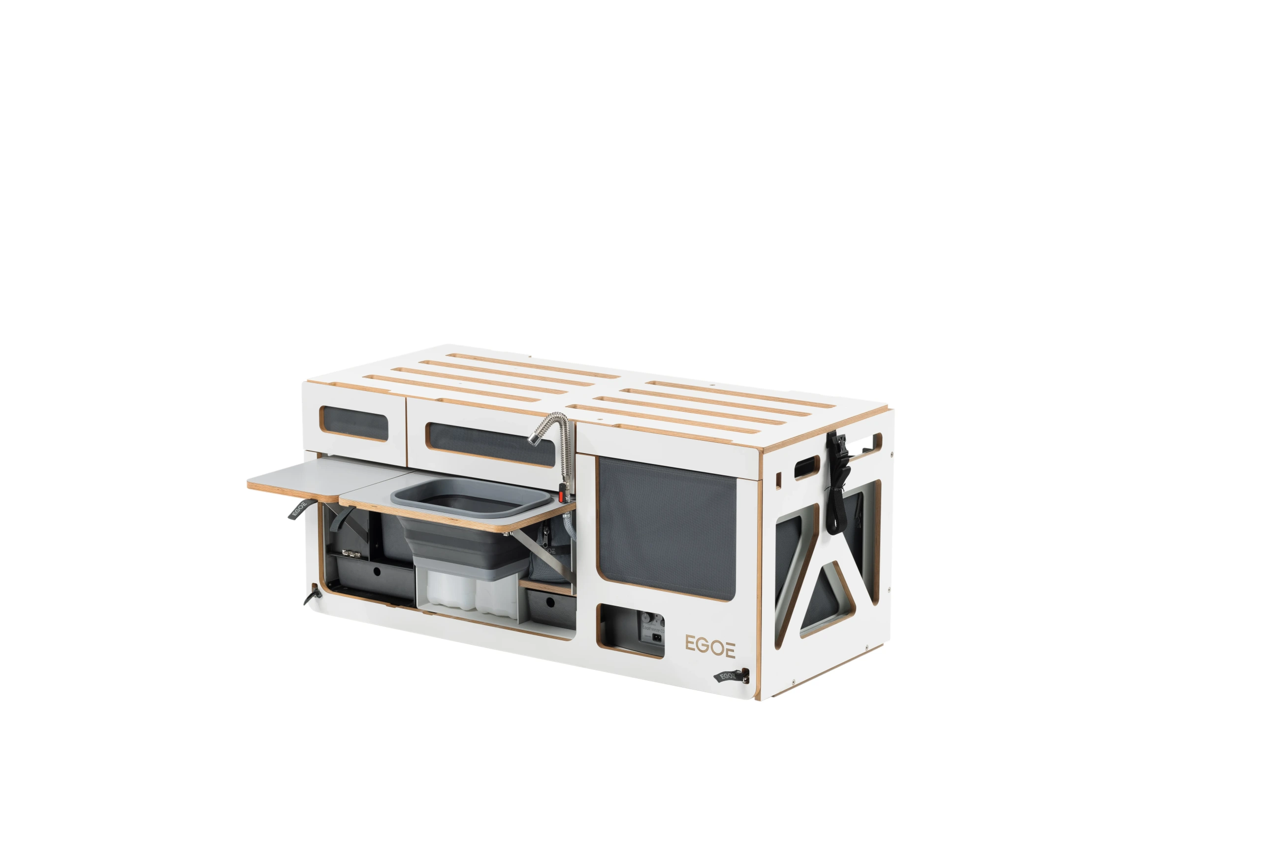 Kuchyňský set je určen pro ty, kteří již mají vyřešené spaní a potřebují plně funkční a mobilní kuchyni. Promění zadní část vašeho vozu v prostor pro přípravu jídla s tekoucí vodou, vařičem a dostatkem úložného prostoru.